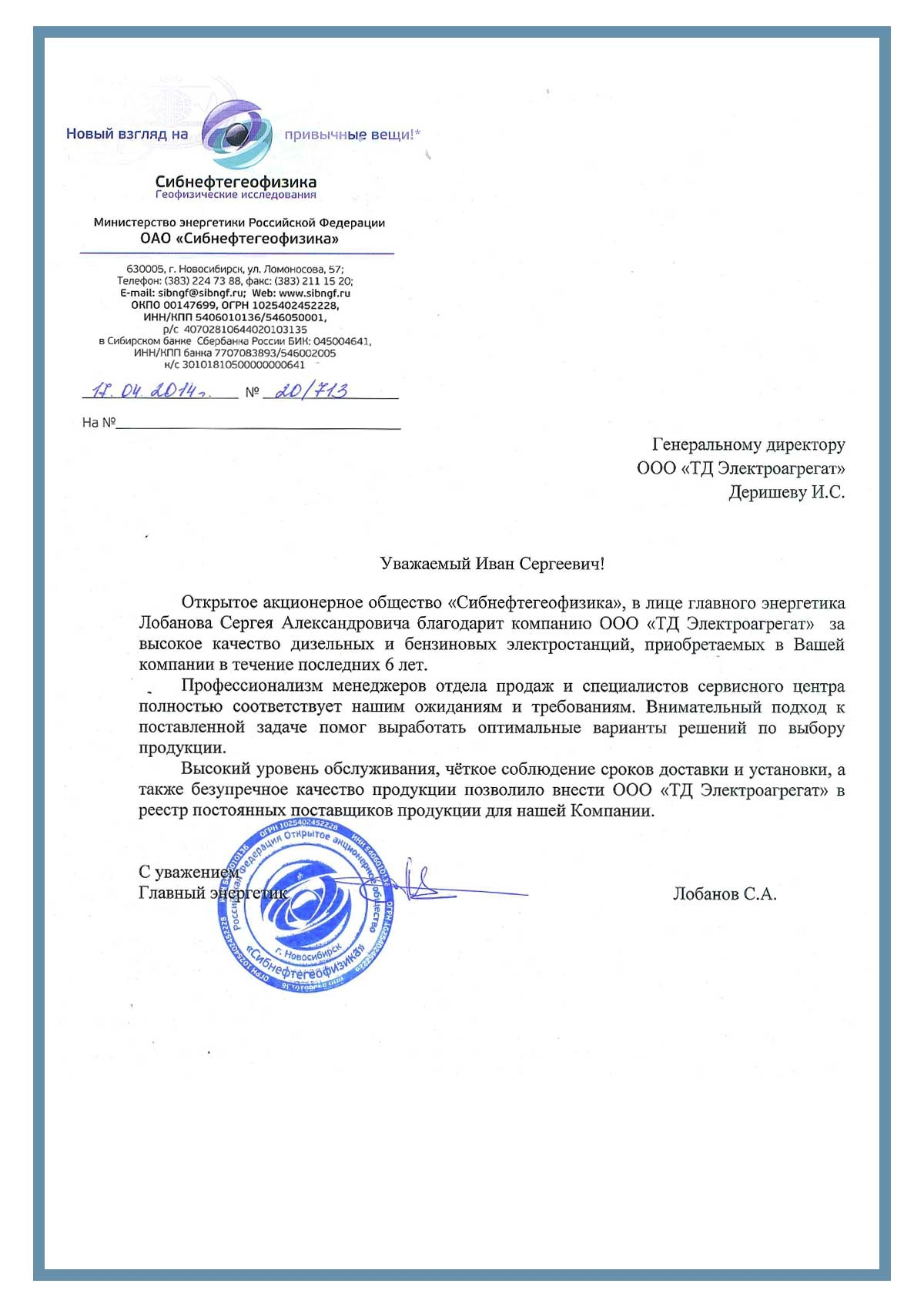 Отзыв контрагентов о компании ООО «ТД Электроагрегат» и  исполненном проекте для ОАО "Сибнефтегеофизика" г. Новосибирск